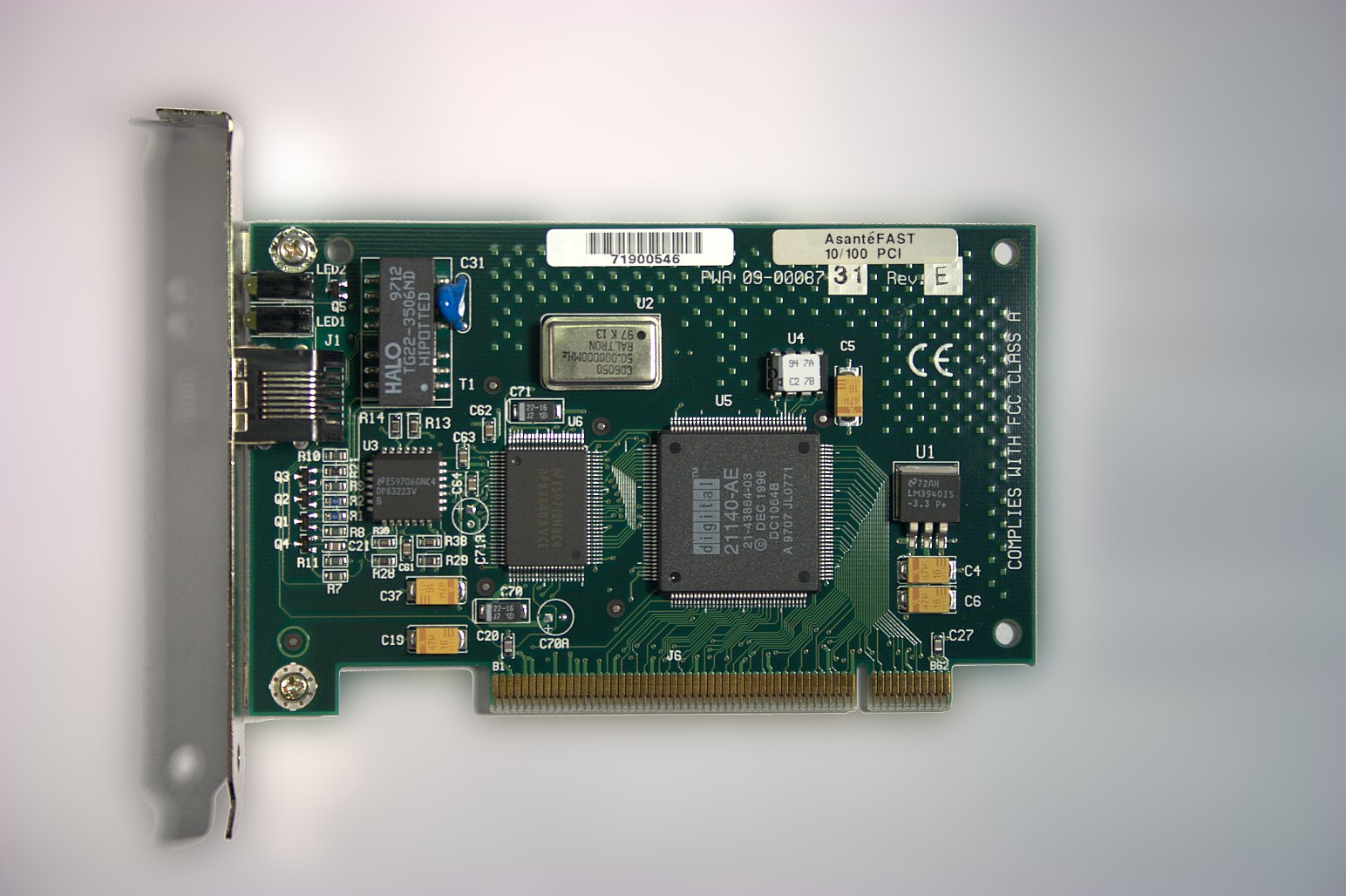 Asante AsanteFAST 10/100 PCI DEC 21140-AE + NS DP83840AVCE + NS DP83223V PCI 32/33, 5V Fast Ethernet TP RJ45: 10Base-T, 100Base-TX