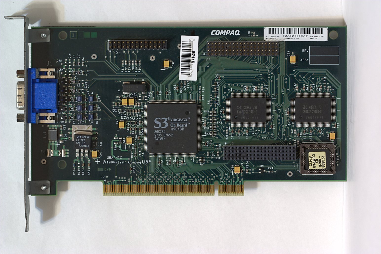 Compaq 296684-001 S3 ViRGE/GX 86C385 PCI 32/33, 5V VGA DSUB 2MB SGRAM (SEC KM4132G271AQ-10 2 x 128K x 32bit x 2 banks)